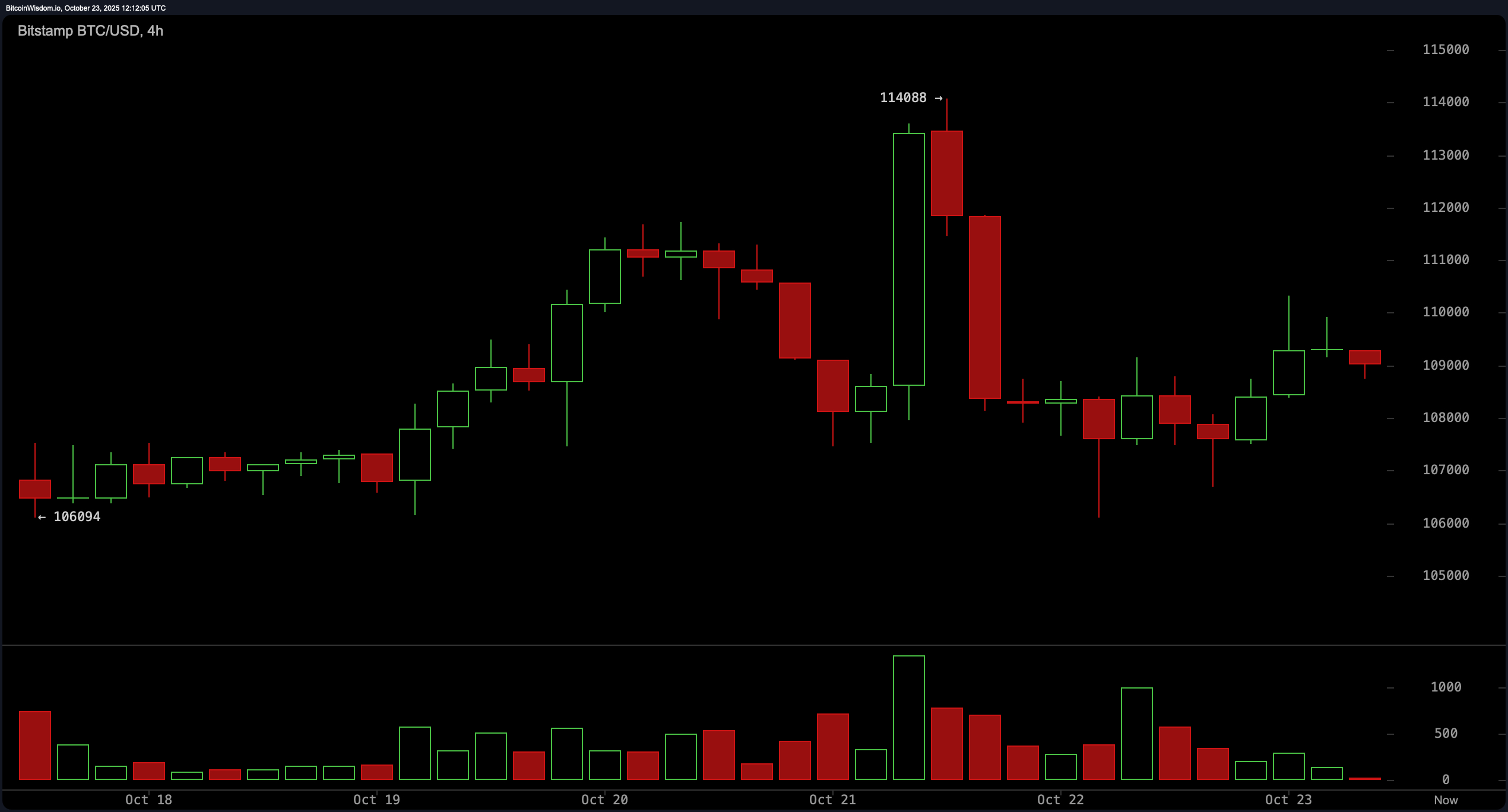 График 4-часовой таймфрейма – это космическая игра в перетягивание каната между взвинченным быком и невыспавшимся медведем. Bitcoin отскочил от $106,094 до $114,088, а затем быстро потерял обороты, как сдувшийся воздушный шарик. Теперь он движется боком между $108k и $110k, потому что, видимо, нерешительность – это его новый бренд. Моментуму нужна порция эспрессо (или машина времени), чтобы вырваться из этого. ☕